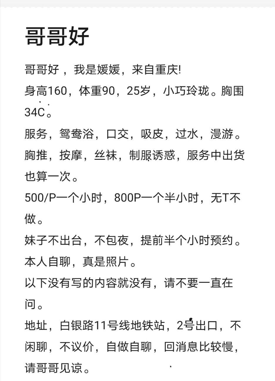 [xinxitop]提示信息[/xinxitop] 为了鼓励会员积极回复验证,只要原帖没聊天截图的,参与验证回复聊天截图都奖励100金币。 【寻欢时间】:2020/7/11 【寻欢地点】:上海嘉定 【信息来源】:狼友推荐、论坛、亲身体验 【服务项目】:鸳鸯浴,漫游,胸推,69式,冰火,口活,爱爱、(可选,勿必填写真实服务项目) 【妹妹数量】:1 【环境设备】:感觉还好 【营业时间】:能约上就行 【价格一览】:500/p 800/pp 【安全评估】:不去最安全 【服务星级】:★★★★★(最高5星)应适当评价质量 【重点推荐】:最值得推荐的地方以供参考 【联系方式】:[unfree]qq:2521917246 qq里有备用的 [/unfree] 【寻欢细节】:妹子身材娇小 性格开朗 小黄文就省了 【附带照片】: