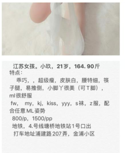 【寻欢细节】:前段时间在论坛里看到了彩彩的自我介绍,肤白貌美,亲人可爱,和一个喜好嫩菜的朋友分享了,没想到朋友竟然摇头说不行,说可以赞助我100前往。我一听还有这等好事,立马加微信和妹子联系,聊了几句就知道是代聊,回复十分及时,哥哥长哥哥短,亲爱的一直喊。本狼实在不喜欢代聊,因为代聊抽成太高导致妹子到手钱很少,到手钱少自然也不想好好服务。所以,还是呼吁各位老狼抵制代聊,并且问候他们的亲人。 言归正传,见是代聊我二话不说就要500,代聊不乐意之后商议了600大洋,其实本狼现在已经打退堂鼓了,但是想到朋友的100赞助费,500找嫩妹打个快餐炮也不亏,于是立马坐上千万座驾前往。 妹子住在浦东巴黎春天后面,一个老小区,代聊时间没有安排好,导致我还等了10分钟,在此再次问候代聊的女性亲属,收了钱办不好事,fw一词可形容之。 上楼见面,第一感觉尚可,只是脸型不对,是团嘟嘟的可爱脸。文身都能对的上,也依稀算是本人,确实是嫩妹一个。 独自洗澡,独自擦干净,妹子自然不会上手。我也做好了心理准备。 抱着嫩妹的黑丝裙,轻轻打开胸罩,露出了没有打粉底的部分,唉! 怎么一个浅黑色的粗糙了得。还是个A! 幸好我也有心理准备,妹子示意让我平躺。连三点都没有直接口,口了几分钟就是干枯的女下活塞,妹子当时还算紧致也没什么水。打桩反正有点无聊。妹子也不会叫床,全程闭眼忍受,大概是我长的不帅吧。。 【附带照片】: