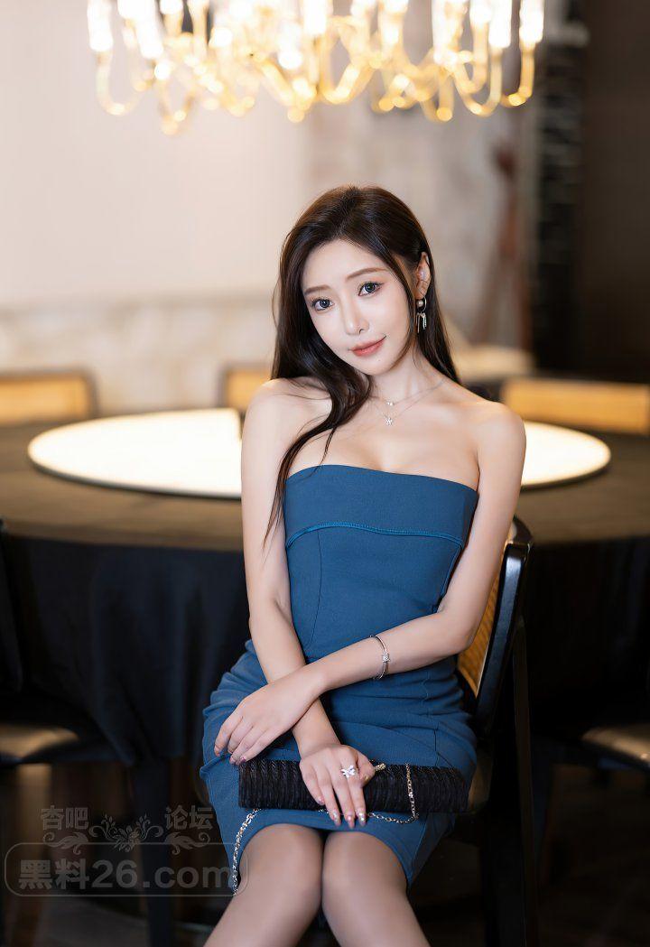 长发性感嫩模王馨瑶蓝色抹胸长裙挺拔酥胸肉丝美腿销魂【19P】