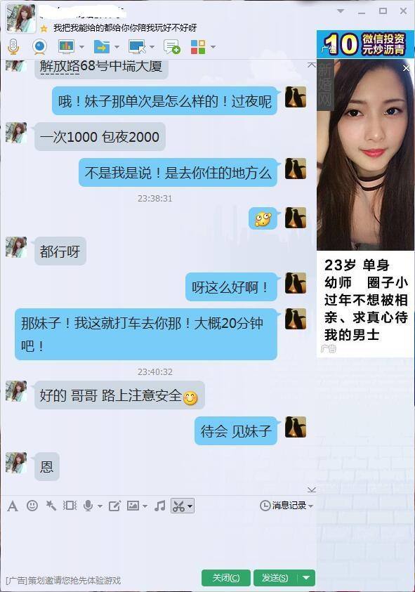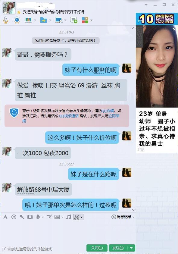 【约会细节】:晚上8点多和哥们吃晚饭,走在繁华的大街上,灯光璀璨,小狼非常想爱爱,拿出炮Q约妹子,哥们推荐一个刚做JZ的年轻妹子长的不错,XL一直是相貌系派的,小狼狂欢若喜,随机要来QQ联系妹子,和妹子约好时间,本狼阅美女无数,哪个男的不想找的是美女咯,也有很多自我安慰的,把灯关了哪个都一样,这个不多研究,个有个的爱好,不在打炮的床上,就在打炮的路上,这话真王八盖子的经典,地方很好找,到了妹妹说好的酒店,第一眼感觉妹妹清纯中透着可爱,犹如邻家暗恋的小妹,166的个子吧,90多斤,比较苗条,配一条吊带前胸开口的白底黑点的超短裙,松敞口的裙子下面两条纤细笔挺的白腿,到也显得挺拨。从露出的白花花胸部可以看出NZ很大,就是一把撑握不了吧,优点在于年轻,妹子脸长的确实也漂亮,二话不说,准备一起和妹子洗澡,浴室很大,抱着妹子一起鸳鸯浴,上床后,妹妹抚摸着小狼的弟弟,惊讶的说:这么大啊?等下要温柔点哦!小狼心里暗暗窃喜,妹妹娇羞的问:要不要口一下?既然有这个服务,本小狼肯定要撒,于是妹妹慢慢低下头,轻含小狼弟弟,口起来了,口活不是很专业,毕竟刚做,也能理解,但身上淡淡的香气却让本小狼如入仙境,口了一会,妹妹慢慢轻伏在小狼耳边轻声说:想要。只有两个字,却把本小狼的潜力爆发出来了,本来硬度是百分之九十五,现在是百分之一百二十!于是让妹妹先坐上来,妹妹轻轻坐上来,慢慢动起来,小狼顿时舒服的也随着妹妹的节奏扭动起来,然后妹妹的频率越来越快,叫声也从刚开始的若有若无变成了喘息,并且全身扭动,甩起了头发,而小狼此刻已经是箭在弦上,突然,妹妹停下来,轻声说:哥哥,你在上面吧?于是小狼小心的拔出弟弟,冷却一分钟,让妹妹睡好,在妹妹身下垫上一个枕头,先欣赏了一下妹妹的小鲍鱼,趁妹子不注意进入妹妹身体,妹妹“啊”的一身,浑身颤抖了一下,抱住了小狼,在小妹动情的呻吟下,奋力冲刺,在妹妹温柔的环抱中射了。。。。。。简单冲洗后抽根烟,交了10张毛爷爷安全撤离了。。。。。