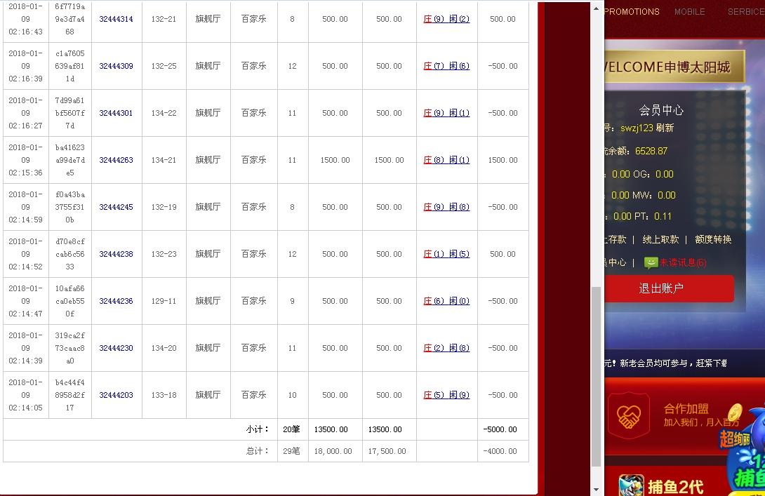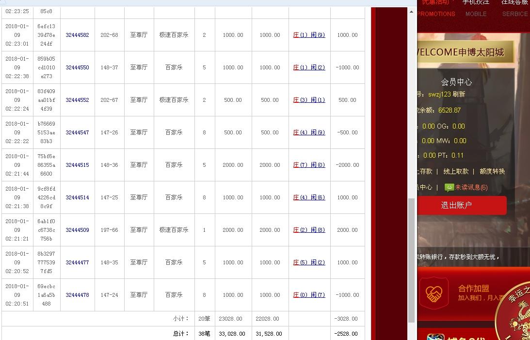[|输单补偿] 01-09申博太阳城lLEBO厅输6528元 |