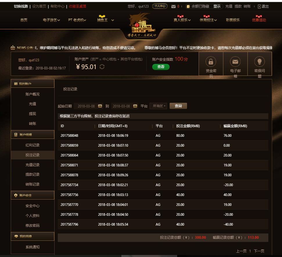 [|赢单奖励] 3-8博马ag平台 赢利113元 |