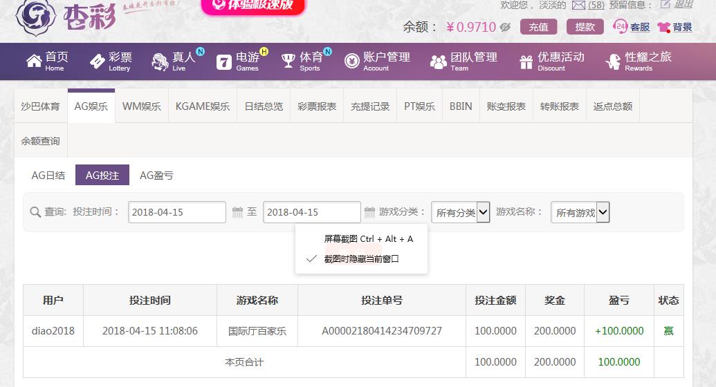 [|赢单奖励] 4月15日杏彩盈利100元 |