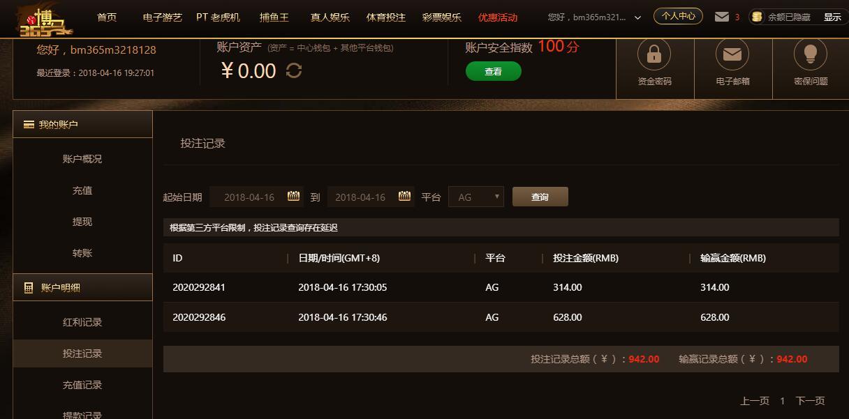 [|赢单奖励] 4-16 博马AG平台 赢利940 |