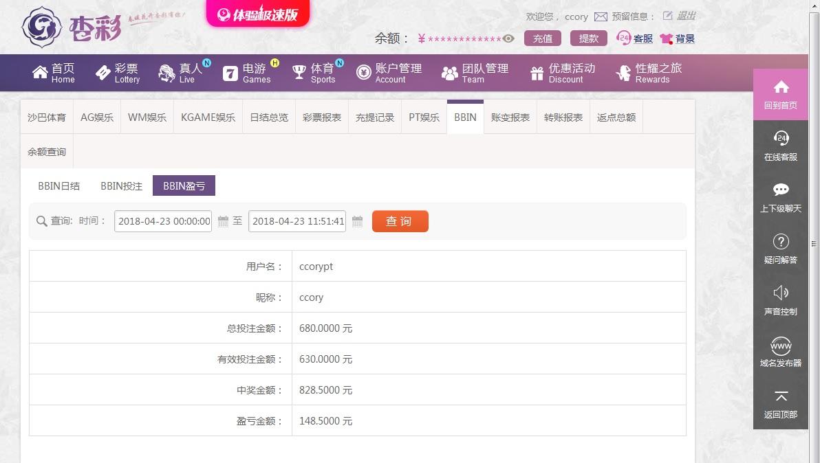 [|赢单奖励] 4月23日杏彩BBIN盈利148元 |
