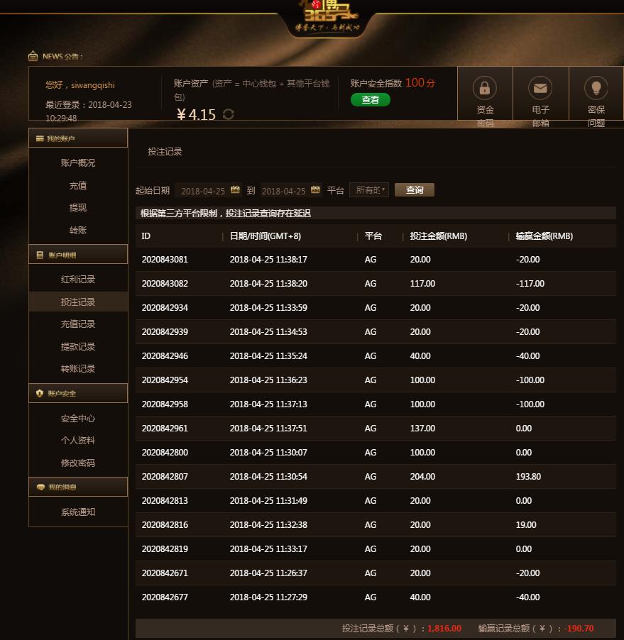 [|输单补偿] 4月25日博马输190 |