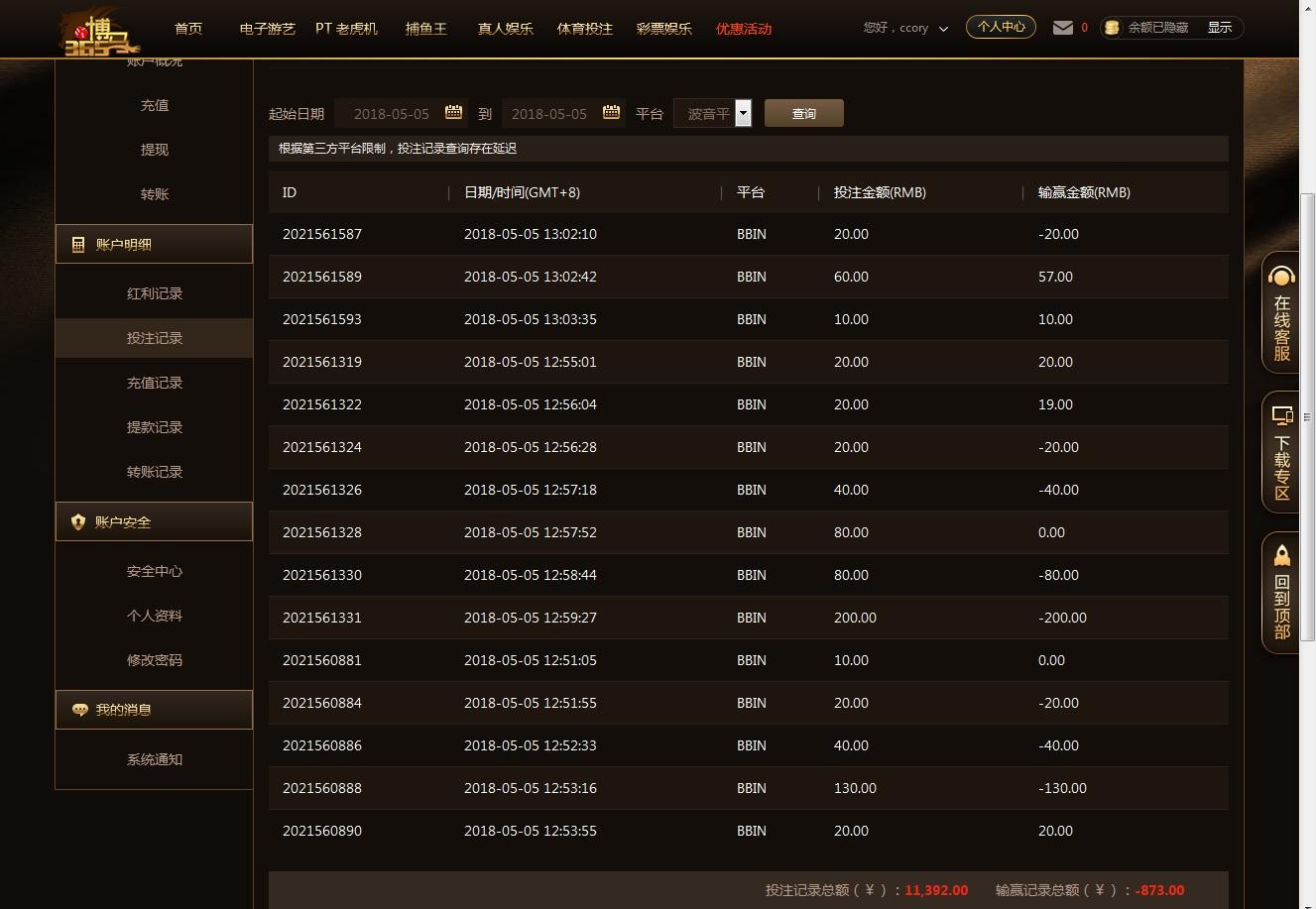 [|输单补偿] 5月5日博马BBIN亏损873元 |