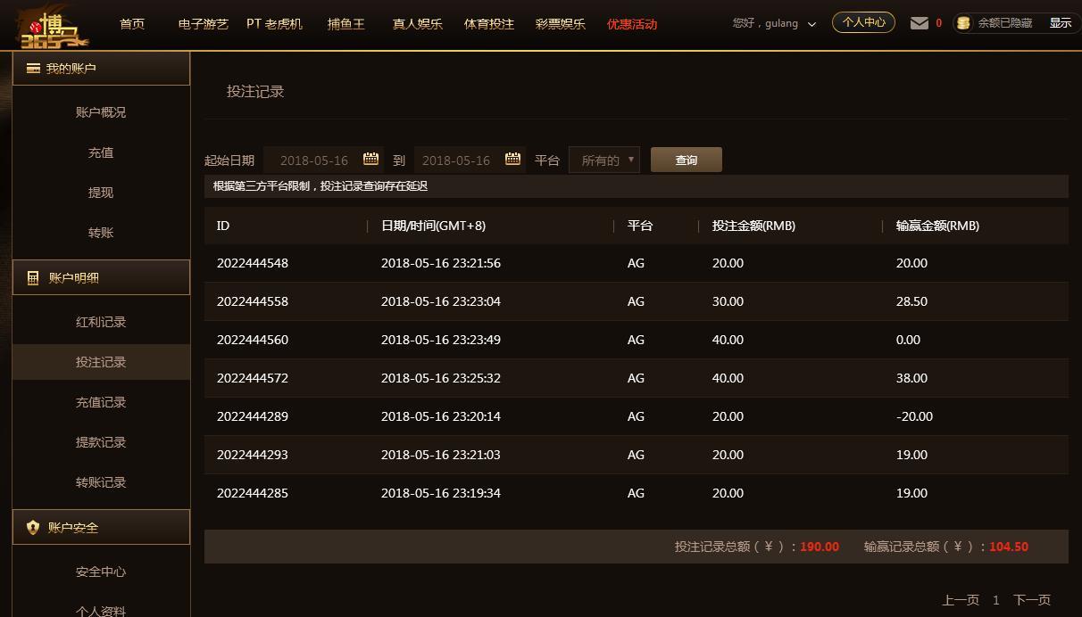 [|赢单奖励] 5月16日博马AG赢利104 |