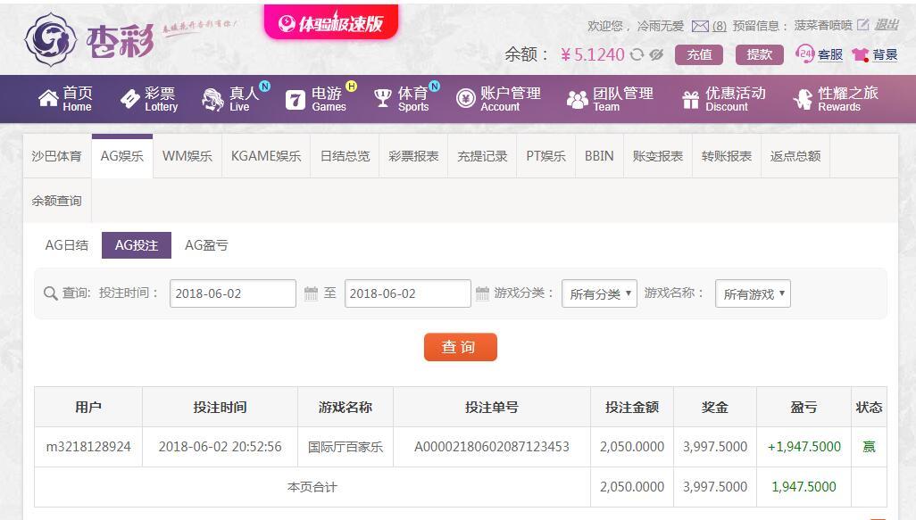 [|赢单奖励] 6-2 杏彩ag平台 赢利1947 |