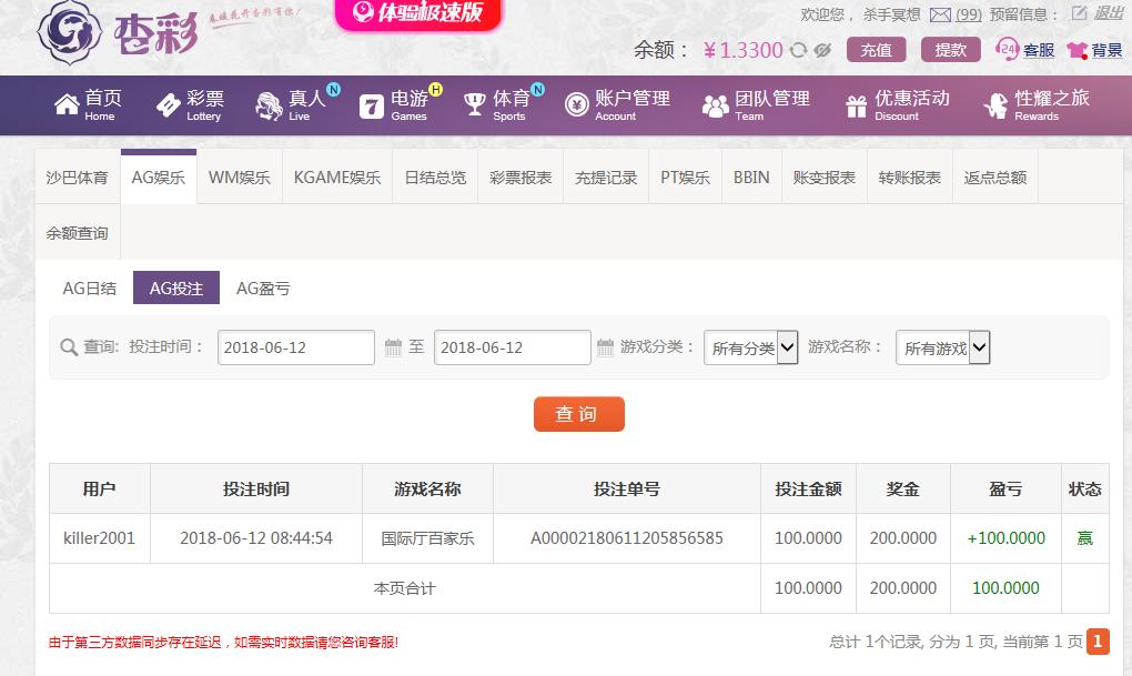 [|赢单奖励] 6-12 杏彩ag平台 赢利100 |