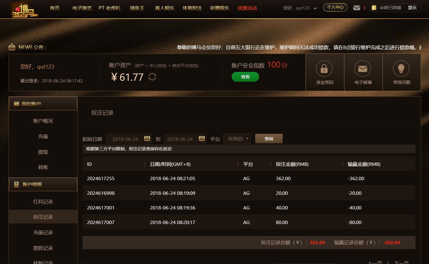 [|输单补偿] 6月24日博马亏损502 |